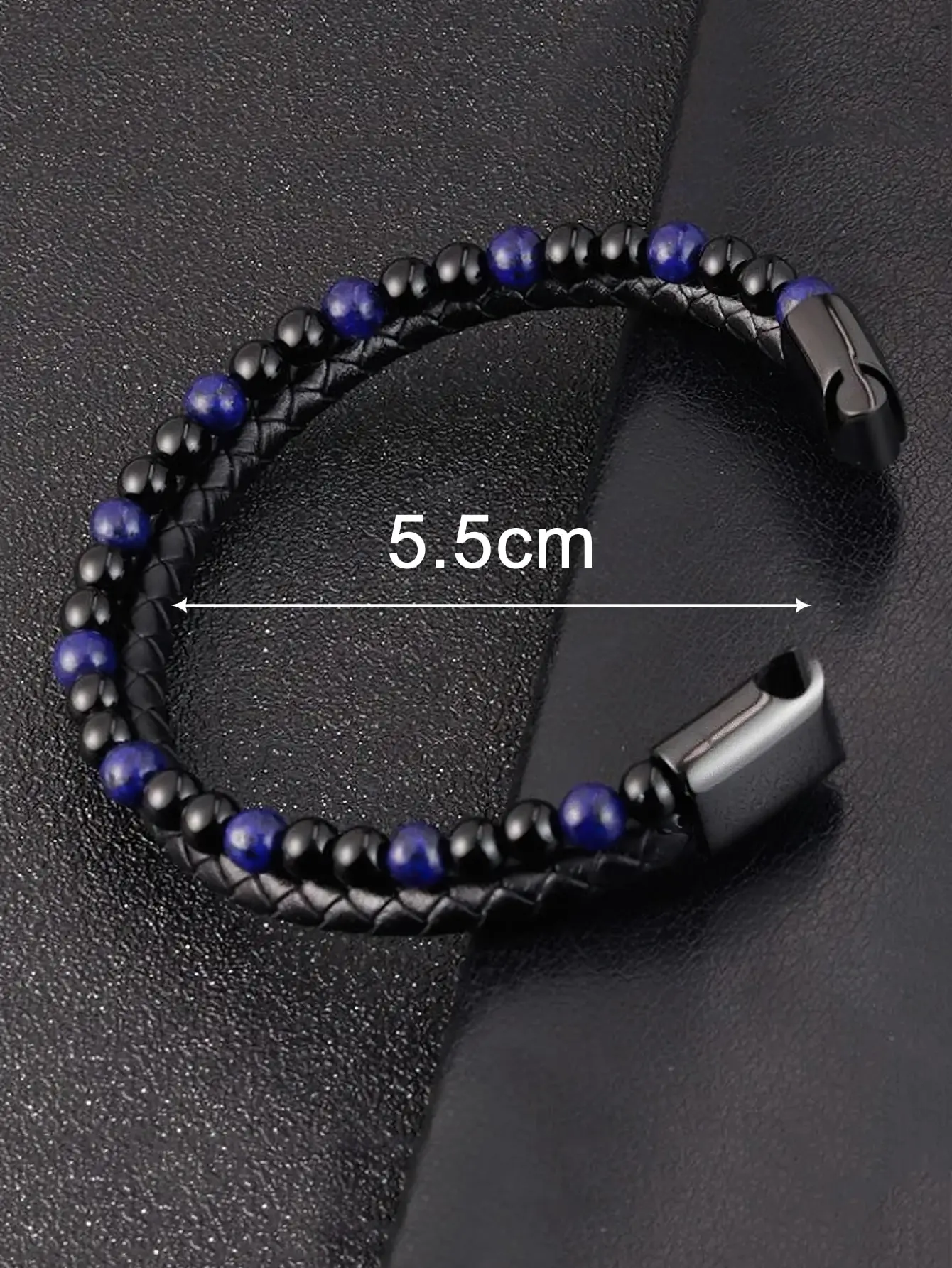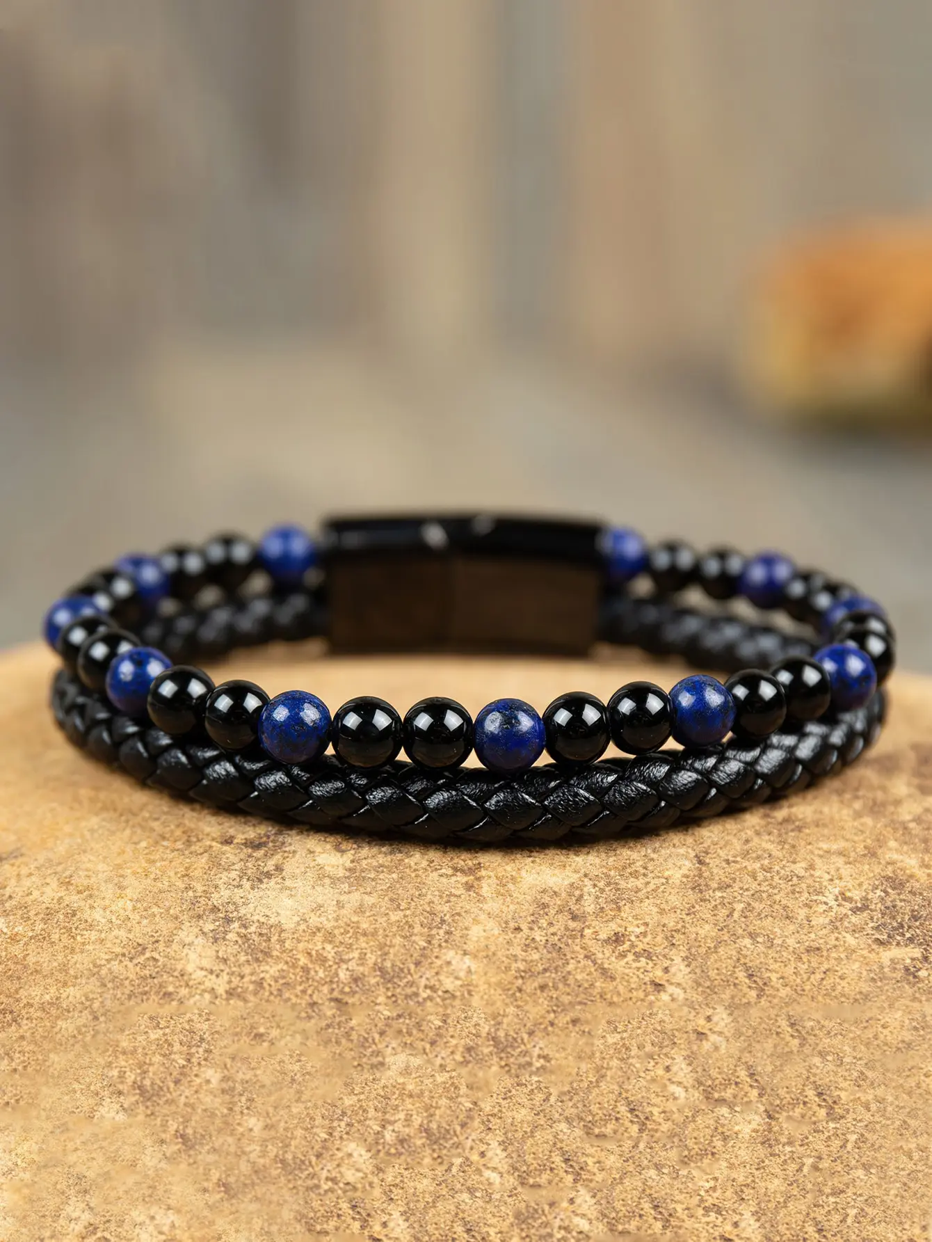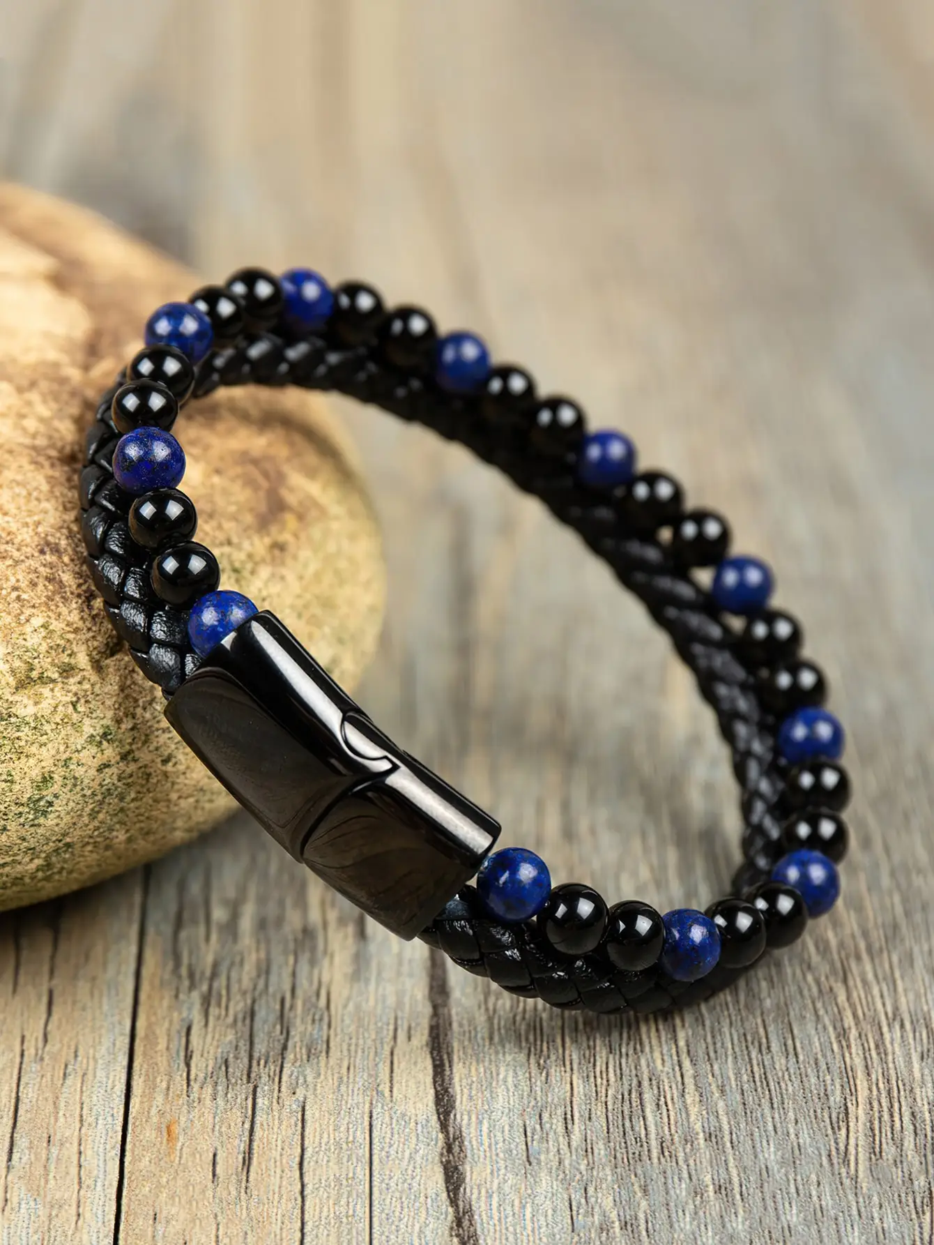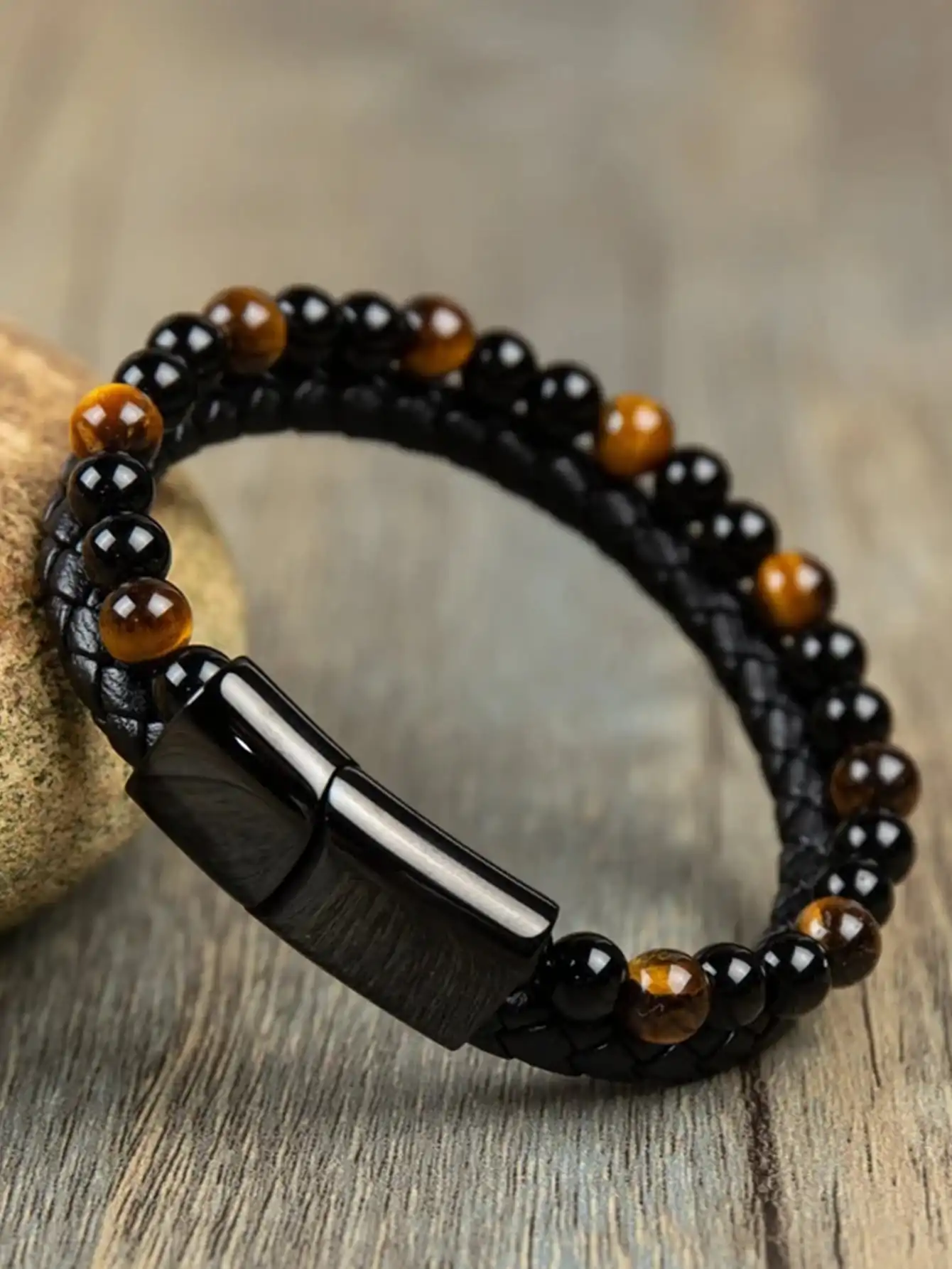 The wrap-style design ensures a comfortable and adjustable fit for most wrists, while the natural stones carry symbolic energy for grounding, focus, and spiritual protection. Ideal for men who value both style and intention, this bracelet makes a thoughtful gift or personal statement piece, blending fashion with holistic wellness in a single, striking accessory. 🖤✨